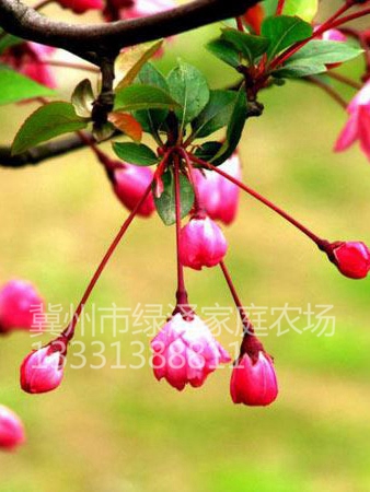 垂丝海棠,落叶小乔木,枝开张,叶卵形,花5~7朵簇生枝端,鲜红色,4~5月开放。高可达8米。枝干峭立,树冠广,卵形。树皮灰褐色、光滑。垂丝海棠性喜阳光,适生于阳光充足、背风之处,土壤要求不严,微酸或微碱性土壤均可成长,但以土层深厚、疏松、肥沃、排水良好略带粘质的生长更好。